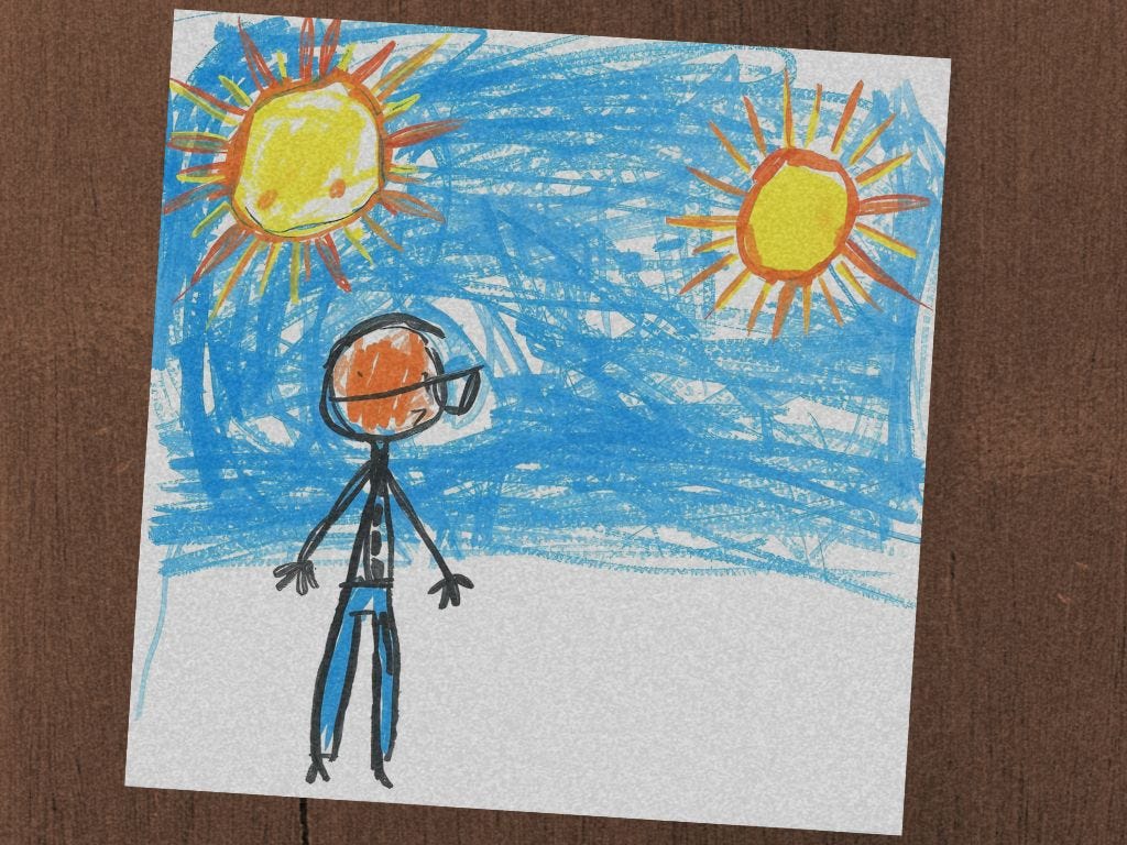 El hombre de palitos se encontraba en el extremo izquierdo del dibujo. Su rostro se orientaba hacia la parte superior derecha: en el cielo brillaban dos enormes —y a la vez pequeños, según la perspectiva— objetos como soles luminosos.